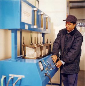 La permeabilità di un fluido attraverso un solido poroso diventa possibile solo se i pori sono tra loro connessi (porosità continua). Nel caso del calcestruzzo, la porosità discontinua, e quindi l’impermeabilità all’acqua, è assicurata solo al di sotto di una certa soglia della porosità capillare: questa corrisponde, per ogni determinato valore di a/c, ad un certo grado di idratazione ? raggiungibile dopo un determinato tempo di stagionatura (Tabella 8.1).I dati della Tabella 8.1 indicano che più elevato è a/c, più lungo deve essere il tempo di stagionatura (e quindi maggiore il grado di idratazione ?) perché il calcestruzzo diventi impermeabile: per esempio, con a/c di 0,55 occorrono 28 giorni di stagionatura umida per conseguire l’impermeabilità del calcestruzzo; se però si adotta un rapporto acqua-cemento di 0,45, è sufficiente appena una settimana per raggiungere lo stesso obiettivo; d’altra parte con a/c molto elevato (> 0,70) non è mai possibile conseguire l’impermeabilità del calcestruzzo.Da un punto di vista pratico la situazione di impermeabilità viene valutata sottoponendo un provino prismatico di calcestruzzo ad acqua sotto pressione per 3 giorni a 5 bar (Fig. 8.6): il calcestruzzo è considerato impermeabile se l’acqua non ha penetrato il materiale per più di 20 mm (Fig. 8.7) per effetto del conseguimento della porosità discontinua (UNI EN 12390-8).Fig. 8.6 – Prova di permeabilità all’acqua in base alla UNI EN 12390/8