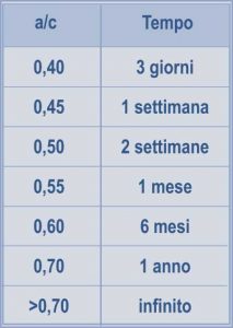 Al pari della resistenza meccanica anche il modulo elastico (§ 9.7) è influenzato dalla porosità capillare attraverso un’equazione del tutto analoga alla [8.2] con un valore per la costante K ovviamente diverso.Tabella 8.1 – Tempo di stagionatura umida richiesto per la impermeabilizzazione del calcestruzzo in relazione al rapporto a/c
